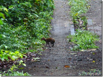 Nach dem gemeinsamen Abendbrot gehen wir früh schlafen, damit wir am nächsten Morgen fit sind für den Dschungel. Kurz nach sechs starten wir bereits und nach einigen hundert Metern entdecken wir die ersten Brüllaffen in den Baumwipfeln. Oder besser gesagt, sie entdecken uns zuerst und machen sich durch lautes Brüllen bemerkbar. Über unseren Köpfen schwingen sie von Ast zu Ast – da hat sich das Frühaufstehen doch schon gelohnt! Einige Kilometer weiter laufen uns ein überdimensional grosses Meerschweinchen (Aguti) über den Weg sowie ein weiteres Tier der gleichen Grösse mit hohen Beinen und Schwanz. In diesen Breitengeraden wäre ein Tierbestimmungsbuch von Vorteil…